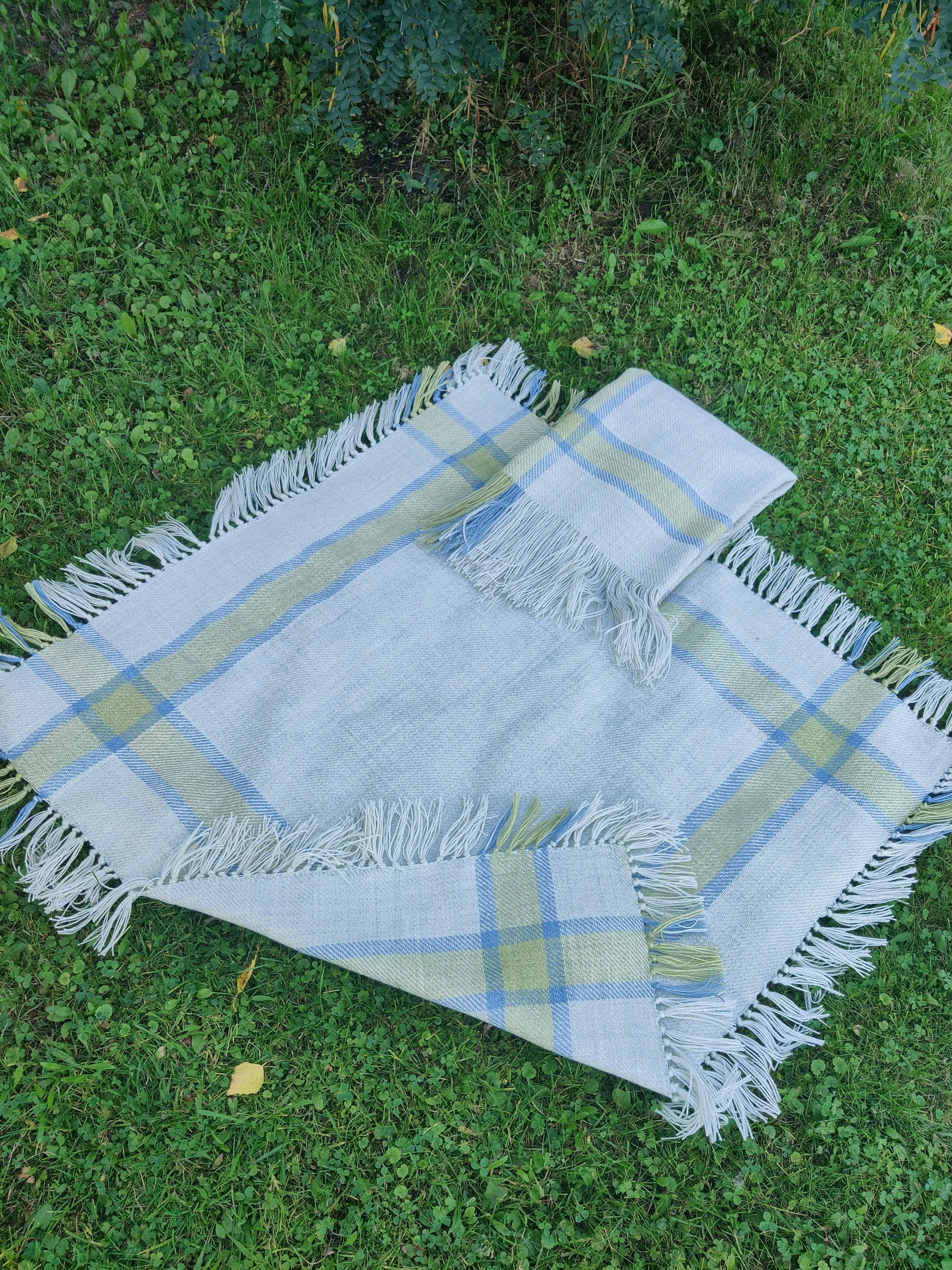 Valmiit toimikas-huivit villasta. Toinen huiveista laitettiin mummon hartiolle hänen matkalleen tuonilmaisiin.